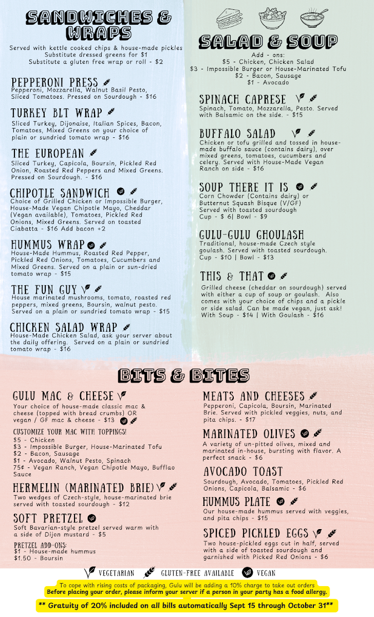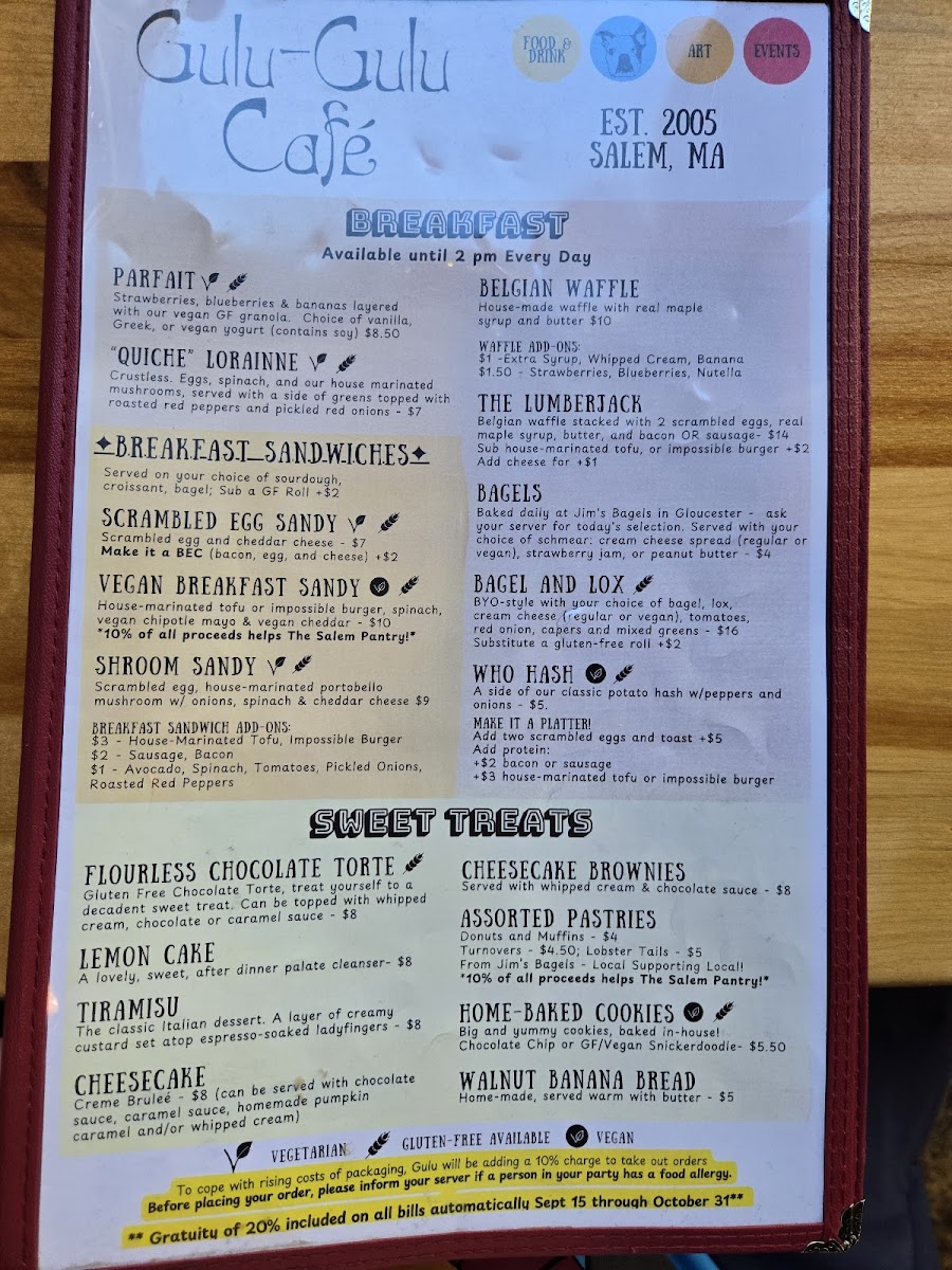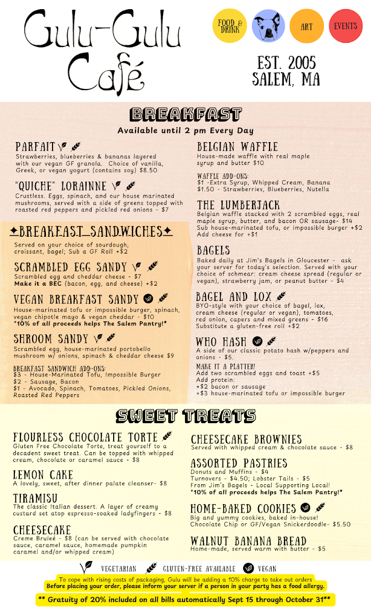 Welcome to Gulu-Gulu Cafe, a charming eatery located in the heart of Salem, MA. Known for its warm, inviting atmosphere, this café offers a delightful menu that caters to diverse tastes. Influential reviews highlight the fancy grilled cheese and the delectable European sandwich—each dish crafted with care to guarantee satisfaction. Guests rave about the stellar coffee, particularly the zesty mindsweeper and the rich cold brews that make for excellent companions to any meal.